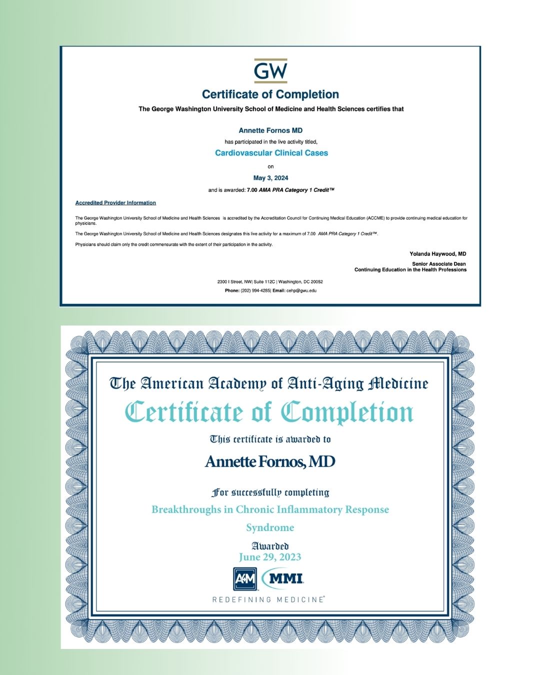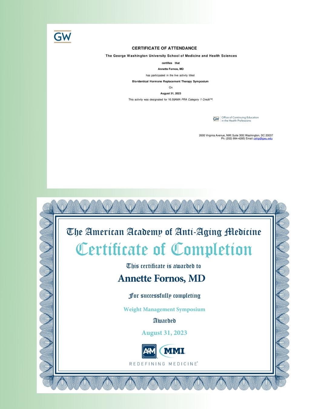 Dr. Annette Fornos holdsย special certification in Longevity Medicine, with advanced training in the use ofย peptides and peptide-supporting therapies. These evidence-based tools help stimulate cellular repair, improve tissue regeneration, support immune modulation, and enhance metabolic and cognitive performanceโall vital components of a healthy aging process.